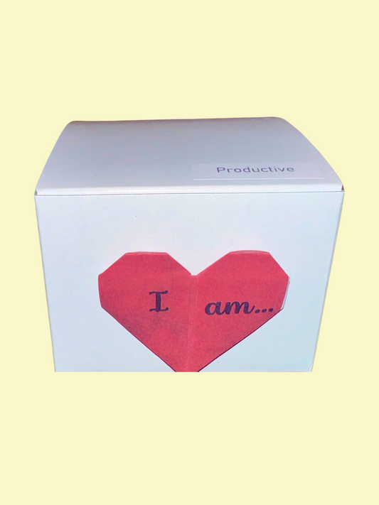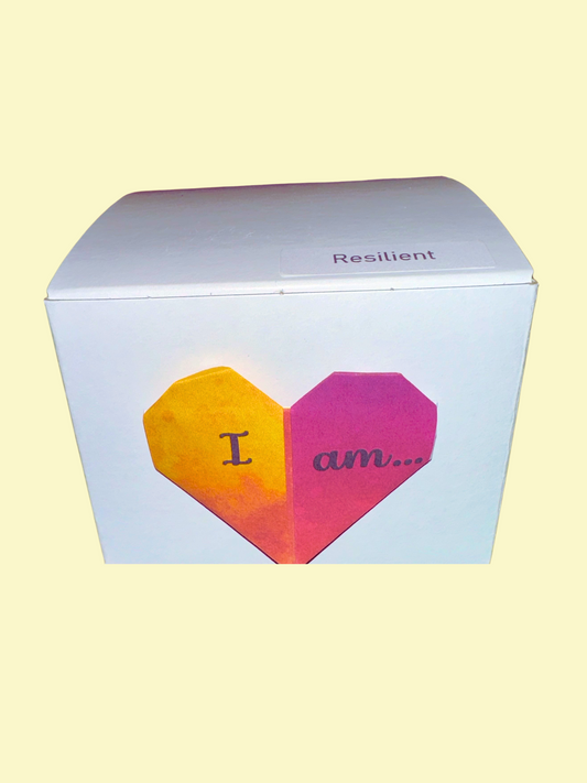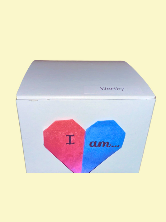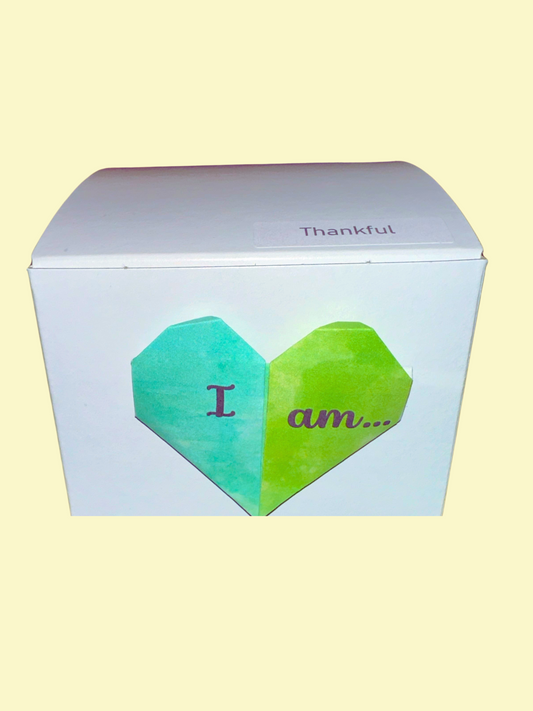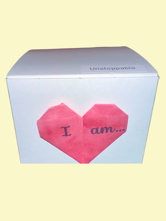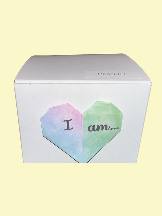 Single, larger Origami cranes with “I am…” Affirmations on their wings and varying watercolor backgrounds with flora designs. Each Affirmation Single has a crystal heart bead on top, as well as two glass lampwork beads below. An “I am” charm hangs from its base.
